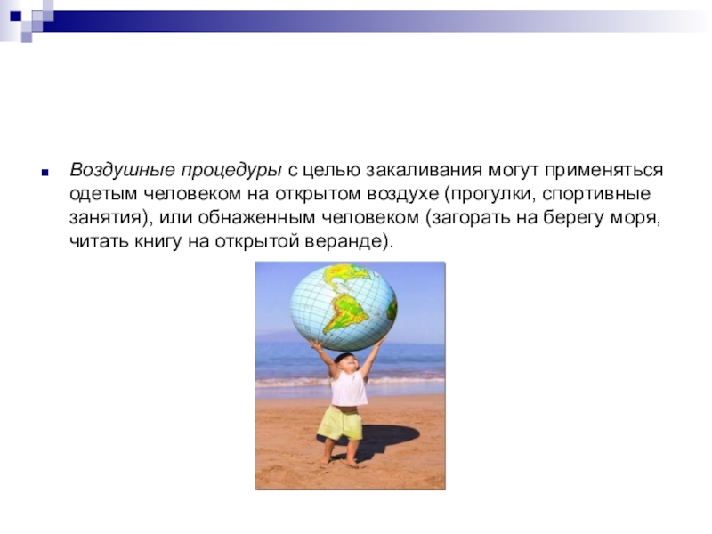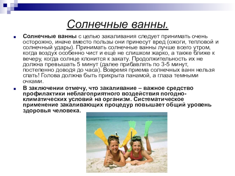 Слайд 24Солнечные ванны с целью закаливания следует принимать очень осторожно, иначе вместо