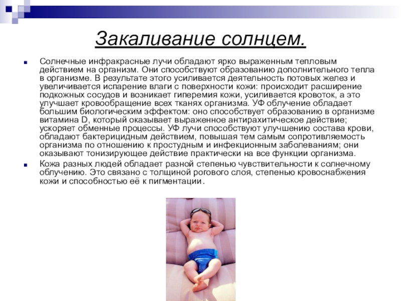 Солнечные инфракрасные лучи обладают ярко выраженным тепловым действием на организм.