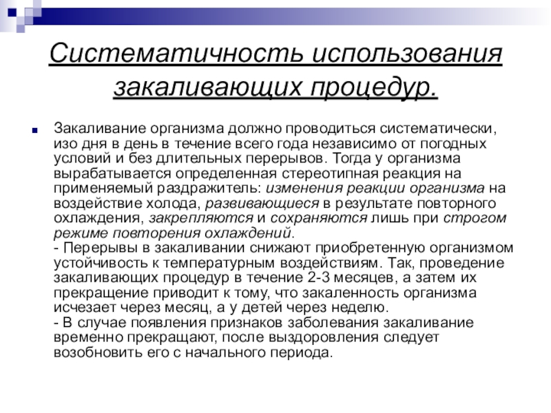 день в течение всего года независимо от погодных условий и без длительных перерывов. Тогда у организма вырабатывается определенная стереотипная реакция на применяемый раздражитель: изменения реакции организма на воздействие холода, развивающиеся в результате повторного охлаждения, закрепляются и сохраняются лишь при строгом режиме повторения охлаждений. - Перерывы в закаливании снижают приобретенную организмом устойчивость к температурным воздействиям. Так, проведение закаливающих процедур в течение 2-3 месяцев, а затем их прекращение приводит к тому, что закаленность организма исчезает через месяц, а у детей через неделю. - В случае появления признаков заболевания закаливание временно прекращают, после выздоровления следует возобновить его с начального периода.