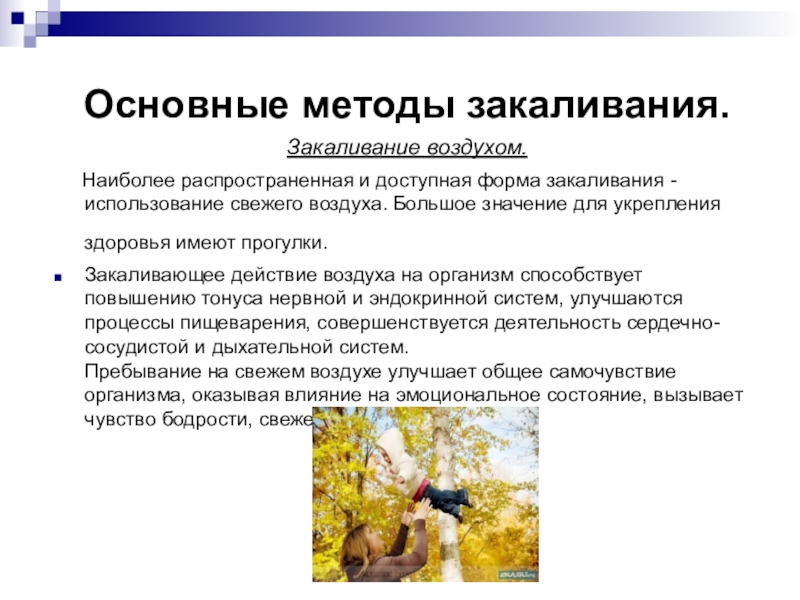 Закаливающее действие воздуха на организм способствует повышению тонуса нервной и эндокринной систем, улучшаются процессы пищеварения, совершенствуется деятельность сердечно-сосудистой и дыхательной систем. Пребывание на свежем воздухе улучшает общее самочувствие организма, оказывая влияние на эмоциональное состояние, вызывает чувство бодрости, свежести.