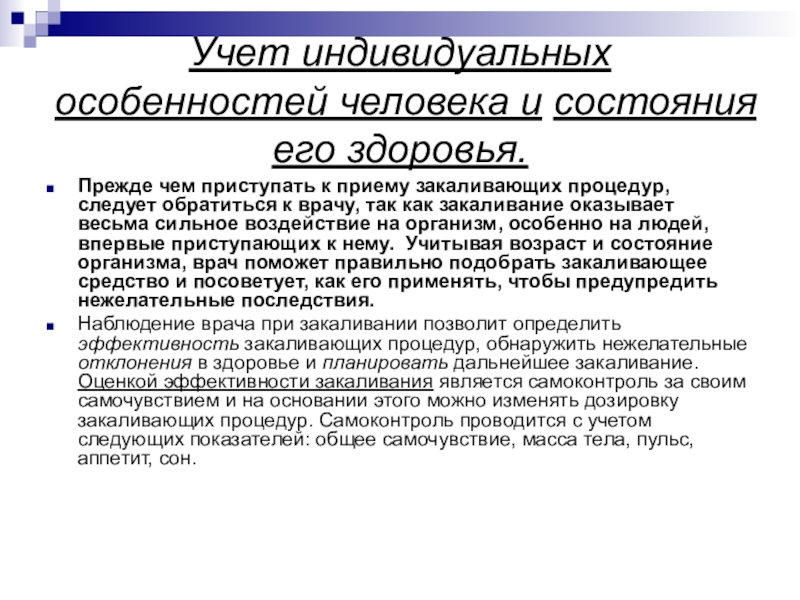 Слайд 9Учет индивидуальных особенностей человека и состояния его здоровья.