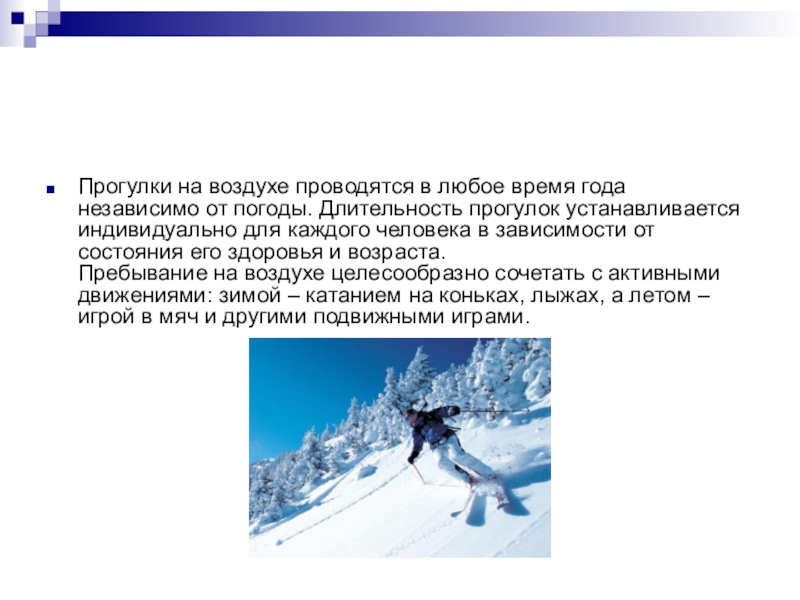 Длительность прогулок устанавливается индивидуально для каждого человека в зависимости от состояния его здоровья и возраста. Пребывание на воздухе целесообразно сочетать с активными движениями: зимой – катанием на коньках, лыжах, а летом – игрой в мяч и другими подвижными играми.