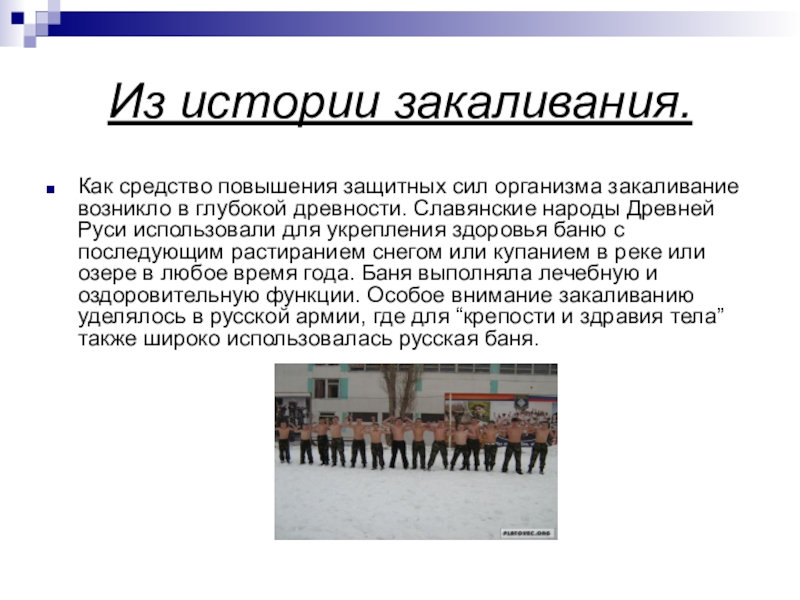 глубокой древности. Славянские народы Древней Руси использовали для укрепления здоровья баню с последующим растиранием снегом или купанием в реке или озере в любое время года. Баня выполняла лечебную и оздоровительную функции. Особое внимание закаливанию уделялось в русской армии, где для “крепости и здравия тела” также широко использовалась русская баня.