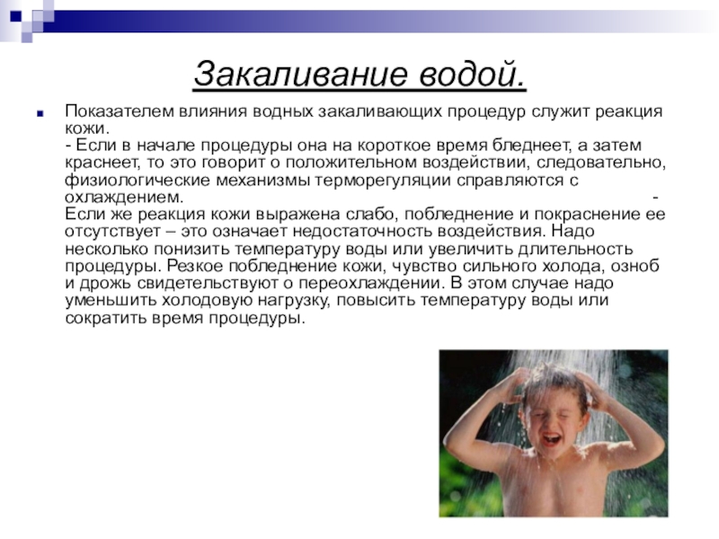 Показателем влияния водных закаливающих процедур служит реакция кожи.