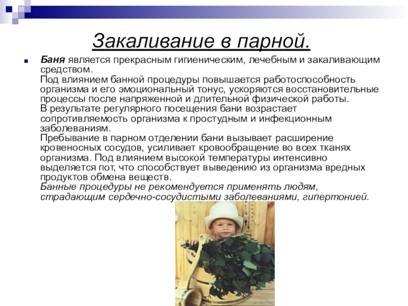Под влиянием банной процедуры повышается работоспособность организма и его эмоциональный тонус, ускоряются восстановительные процессы после напряженной и длительной физической работы. В результате регулярного посещения бани возрастает сопротивляемость организма к простудным и инфекционным заболеваниям. Пребывание в парном отделении бани вызывает расширение кровеносных сосудов, усиливает кровообращение во всех тканях организма. Под влиянием высокой температуры интенсивно выделяется пот, что способствует выведению из организма вредных продуктов обмена веществ. Банные процедуры не рекомендуется применять людям, страдающим сердечно-сосудистыми заболеваниями, гипертонией.