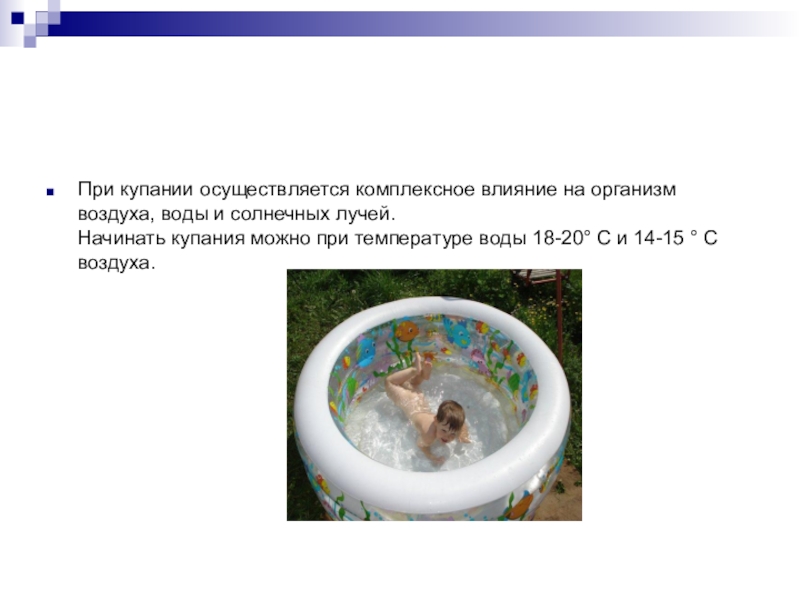 При купании осуществляется комплексное влияние на организм воздуха, воды и солнечных