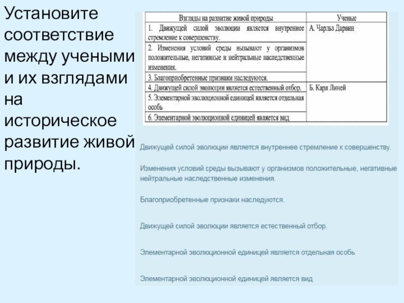 Слайд 2Установите соответствие между учеными и их взглядами на историческое развитие живой