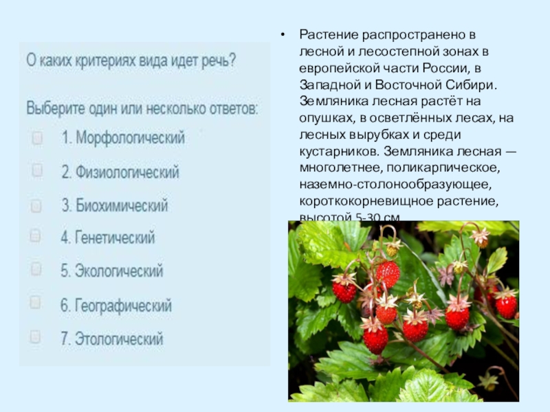в Западной и Восточной Сибири. Земляника лесная растёт на опушках, в осветлённых лесах, на лесных вырубках и среди кустарников. Земляника лесная — многолетнее, поликарпическое, наземно-столонообразующее, короткокорневищное растение, высотой 5-30 см.
