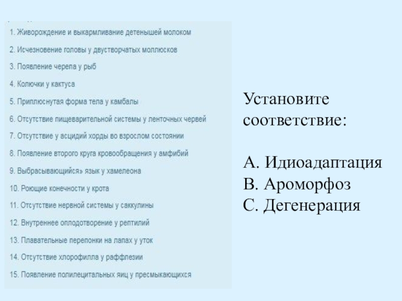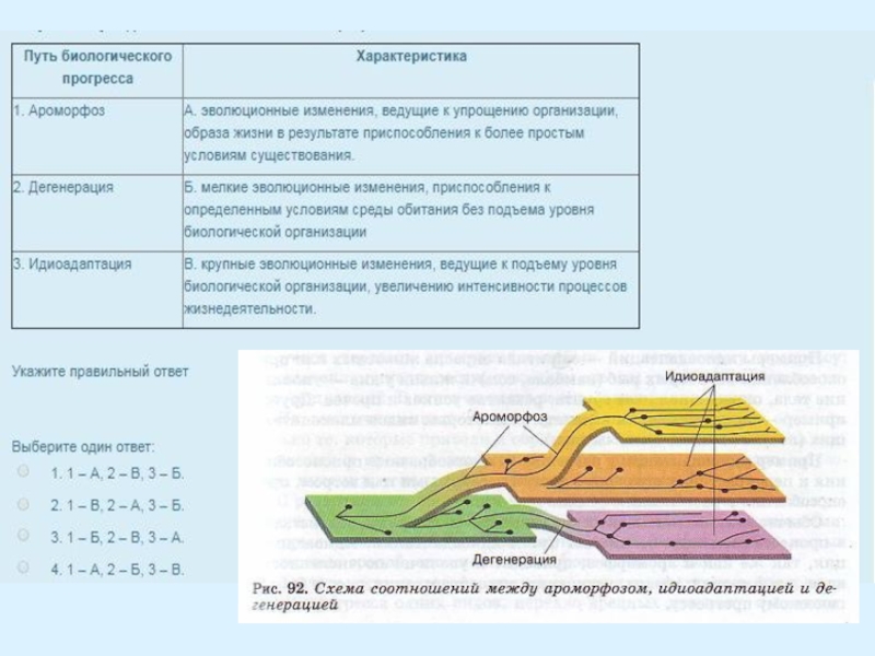А. Идиоадаптация В. Ароморфоз С. Дегенерация