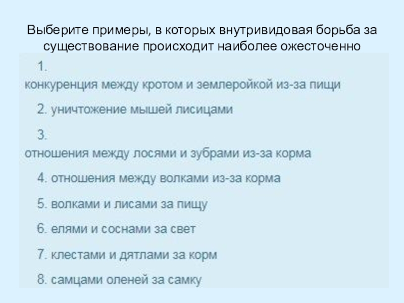 Слайд 5Выберите примеры, в которых внутривидовая борьба за существование происходит наиболее ожесточенно
