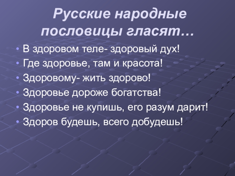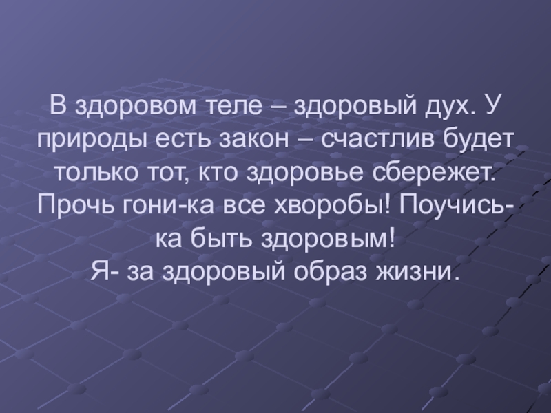 Слайд 15В здоровом теле – здоровый дух. У природы есть закон –
