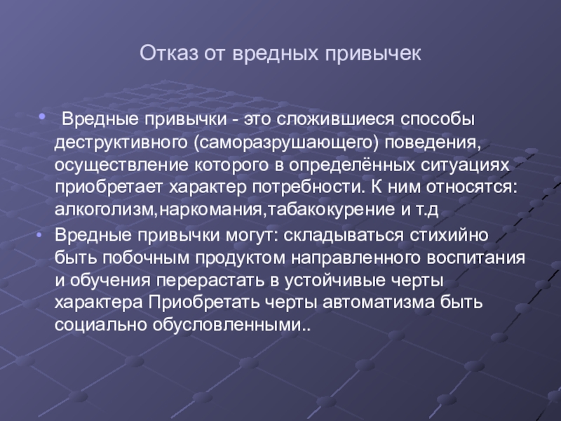 Вредные привычки могут: складываться стихийно быть побочным продуктом направленного воспитания и обучения перерастать в устойчивые черты характера Приобретать черты автоматизма быть социально обусловленными..