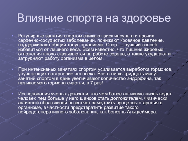 сердечно-сосудистых заболеваний, понижают кровяное давление, поддерживают общий тонус организма. Спорт – лучший способ избавиться от лишнего веса. Всем известно, что лишние жировые отложения плохо сказываются на работе сердца, а также ухудшают и затрудняют работу организма в целом.