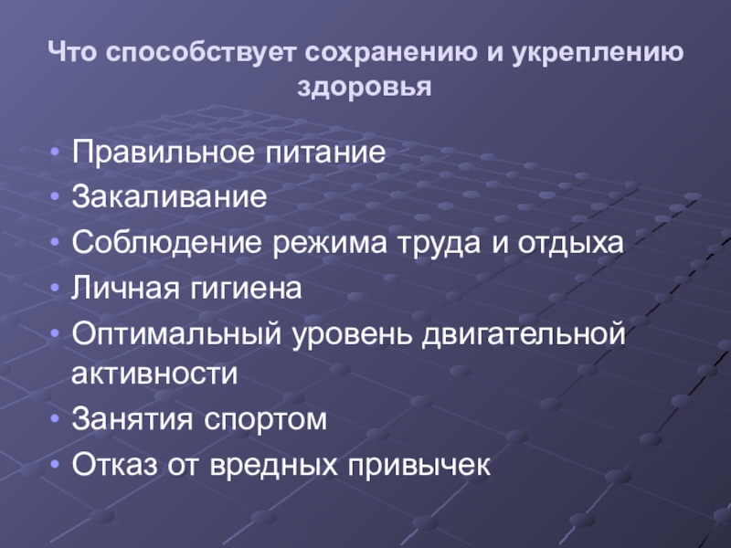 Слайд 7Что способствует сохранению и укреплению здоровья
