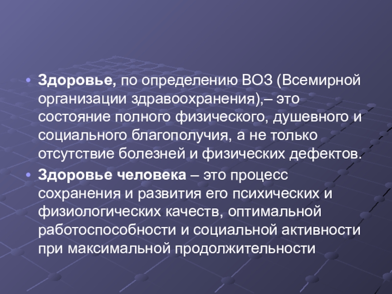 Здоровье человека – это процесс сохранения и развития его психических и физиологических качеств, оптимальной работоспособности и социальной активности при максимальной продолжительности