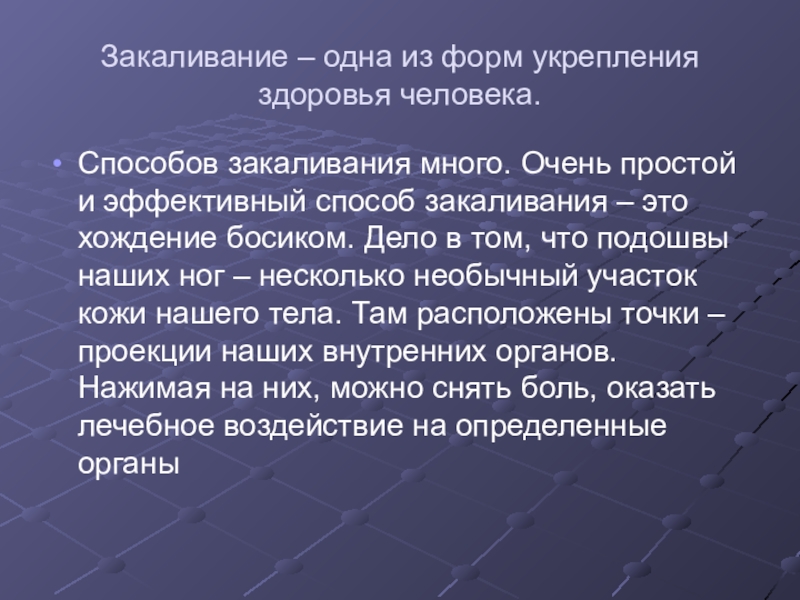 простой и эффективный способ закаливания – это хождение босиком. Дело в том, что подошвы наших ног – несколько необычный участок кожи нашего тела. Там расположены точки – проекции наших внутренних органов. Нажимая на них, можно снять боль, оказать лечебное воздействие на определенные органы