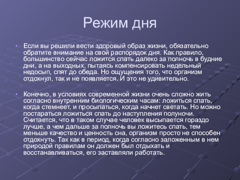 Конечно, в условиях современной жизни очень сложно жить согласно внутренним биологическим часам: ложиться спать, когда стемнеет, и просыпаться, когда начнет светать. Но можно постараться ложиться спать до наступления полуночи. Считается, что в таком случае человек высыпается гораздо лучше, а чем дальше за полночь вы ложитесь спать, тем меньше качество и ценность сна, организм просто не способен отдохнуть. Так как в период, когда согласно заложенным в нем природой правилам он должен был отдыхать и восстанавливаться, его заставляли работать.