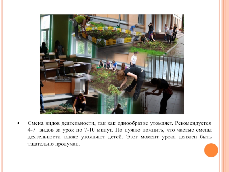 Слайд 9Смена видов деятельности, так как однообразие утомляет. Рекомендуется 4-7 видов за