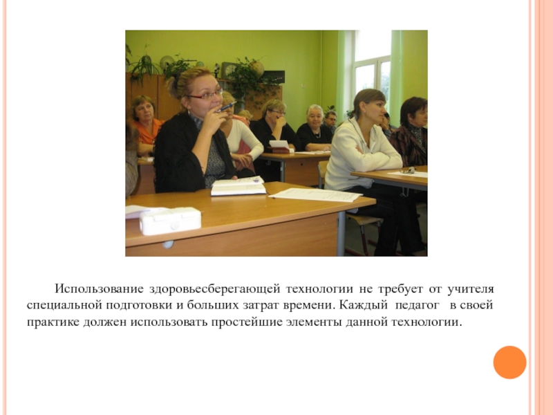 Слайд 18Использование здоровьесберегающей технологии не требует от учителя специальной подготовки и больших