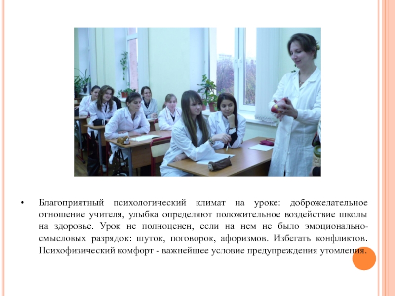 воздействие школы на здоровье. Урок не полноценен, если на нем не было эмоционально-смысловых разрядок: шуток, поговорок, афоризмов. Избегать конфликтов. Психофизический комфорт - важнейшее условие предупреждения утомления.