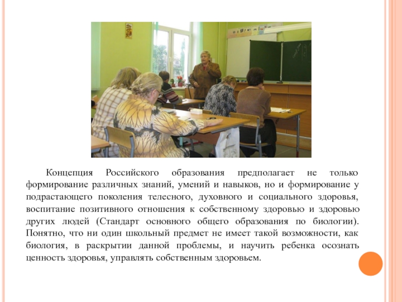 навыков, но и формирование у подрастающего поколения телесного, духовного и социального здоровья, воспитание позитивного отношения к собственному здоровью и здоровью других людей (Стандарт основного общего образования по биологии). Понятно, что ни один школьный предмет не имеет такой возможности, как биология, в раскрытии данной проблемы, и научить ребенка осознать ценность здоровья, управлять собственным здоровьем.