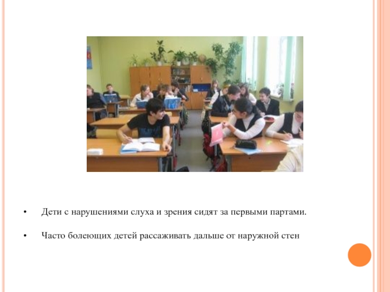 Слайд 15Дети с нарушениями слуха и зрения сидят за первыми партами.
