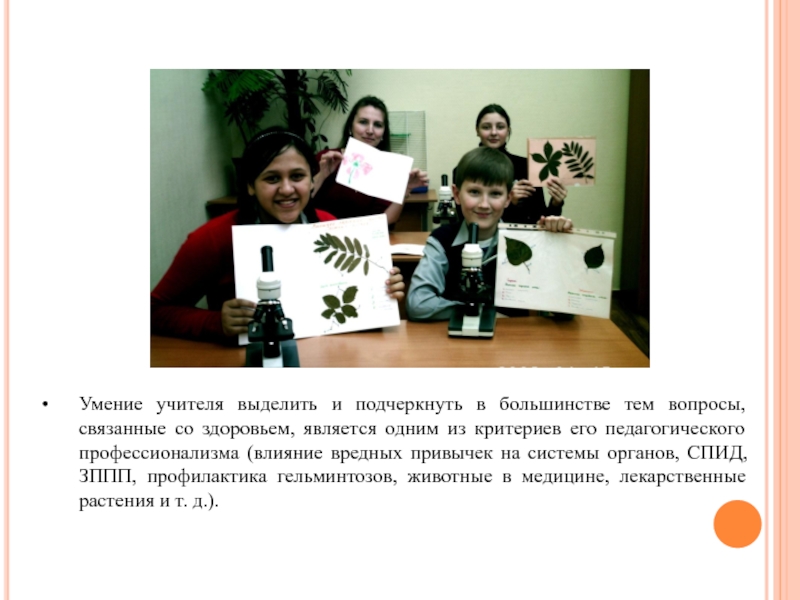 здоровьем, является одним из критериев его педагогического профессионализма (влияние вредных привычек на системы органов, СПИД, ЗППП, профилактика гельминтозов, животные в медицине, лекарственные растения и т. д.).