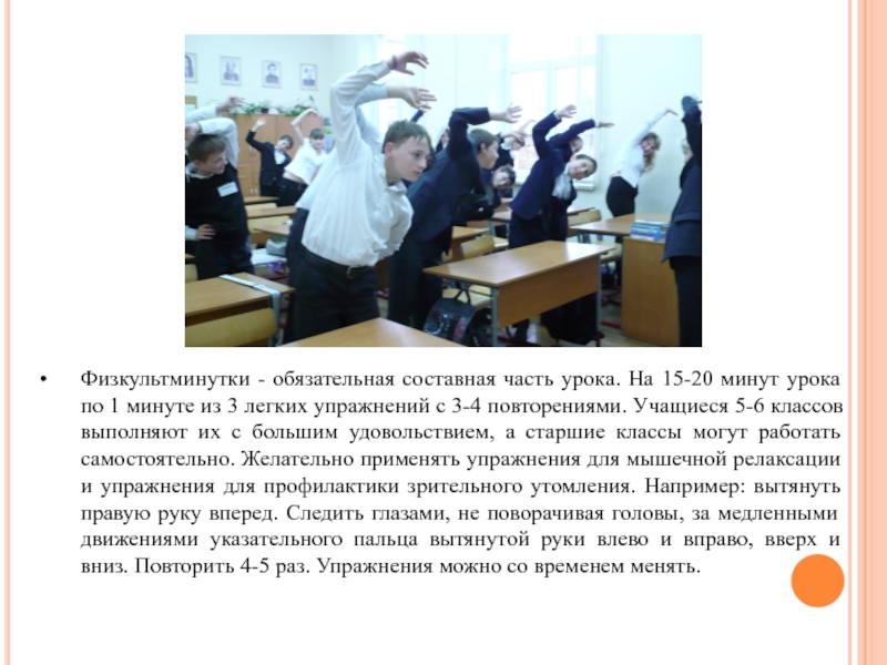 1 минуте из 3 легких упражнений с 3-4 повторениями. Учащиеся 5-6 классов выполняют их с большим удовольствием, а старшие классы могут работать самостоятельно. Желательно применять упражнения для мышечной релаксации и упражнения для профилактики зрительного утомления. Например: вытянуть правую руку вперед. Следить глазами, не поворачивая головы, за медленными движениями указательного пальца вытянутой руки влево и вправо, вверх и вниз. Повторить 4-5 раз. Упражнения можно со временем менять.