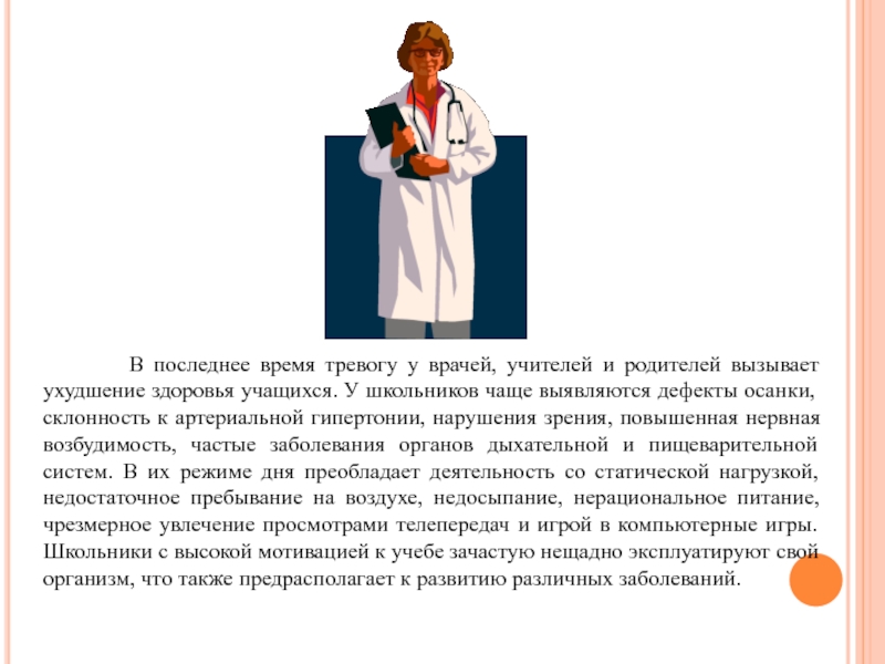 учителей и родителей вызывает ухудшение здоровья учащихся. У школьников чаще выявляются дефекты осанки, склонность к артериальной гипертонии, нарушения зрения, повышенная нервная возбудимость, частые заболевания органов дыхательной и пищеварительной систем. В их режиме дня преобладает деятельность со статической нагрузкой, недостаточное пребывание на воздухе, недосыпание, нерациональное питание, чрезмерное увлечение просмотрами телепередач и игрой в компьютерные игры. Школьники с высокой мотивацией к учебе зачастую нещадно эксплуатируют свой организм, что также предрасполагает к развитию различных заболеваний.