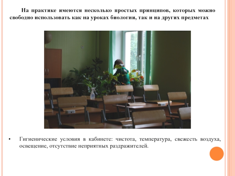Слайд 8Гигиенические условия в кабинете: чистота, температура, свежесть воздуха, освещение, отсутствие неприятных