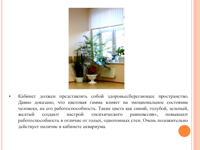 Слайд 16Кабинет должен представлять собой здоровьесберегающее пространство. Давно доказано, что цветовая гамма