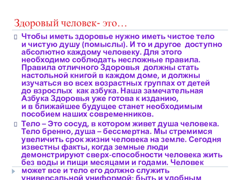 Здоровый человек- это…Чтобы иметь здоровье нужно иметь чистое тело и чистую душу (помыслы). И то и другое  доступно абсолютно каждому человеку. Для этого