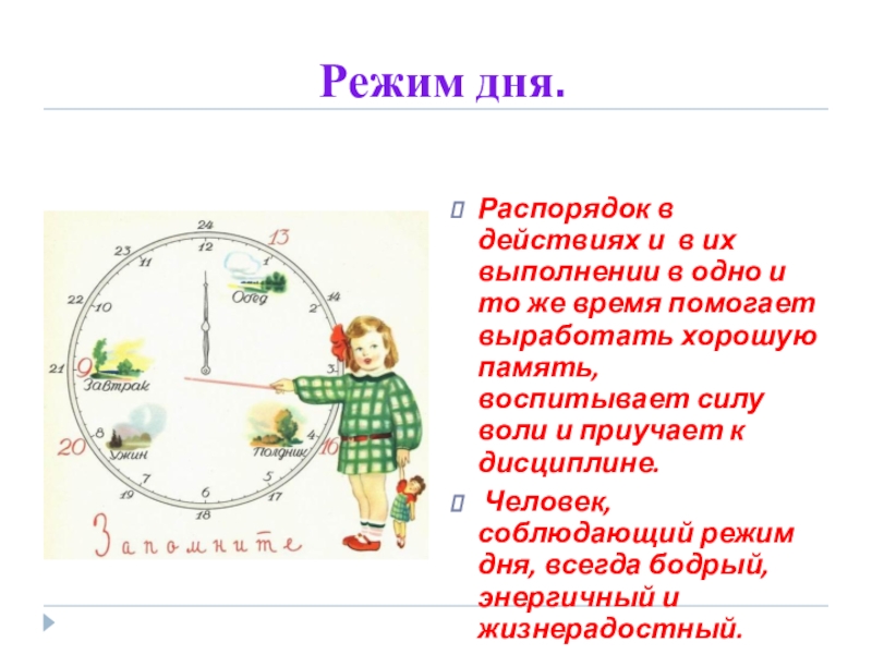 Режим дня.Распорядок в действиях и в их выполнении в одно и то же время помогает выработать