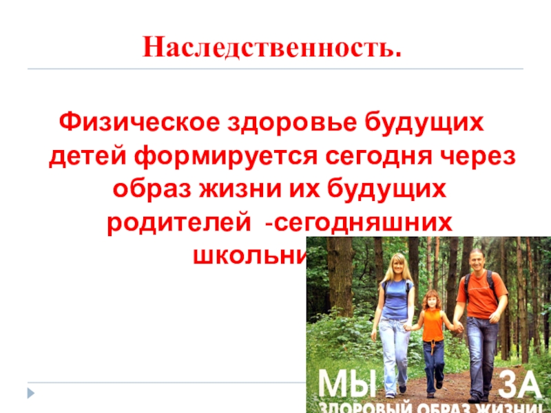 Наследственность.Физическое здоровье будущих детей формируется сегодня через образ жизни их будущих родителей -сегодняшних школьников.