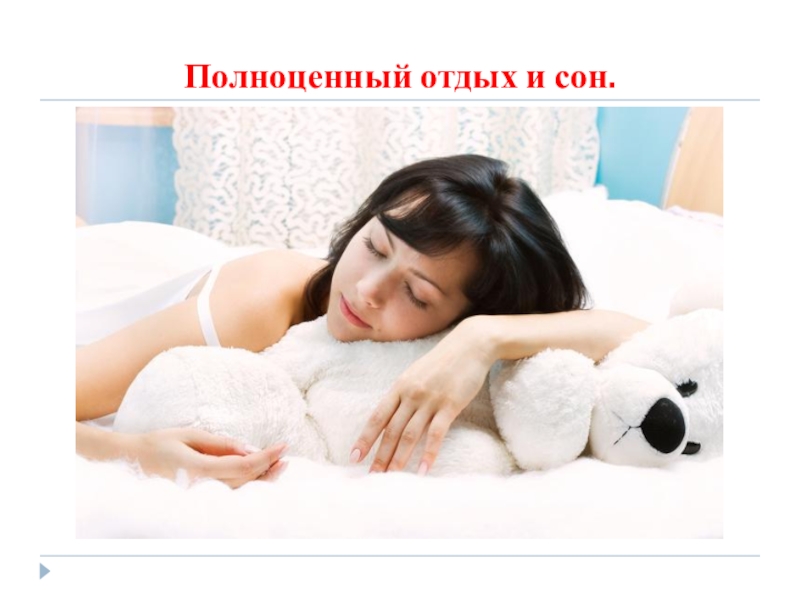 Слайд 8Полноценный отдых и сон.