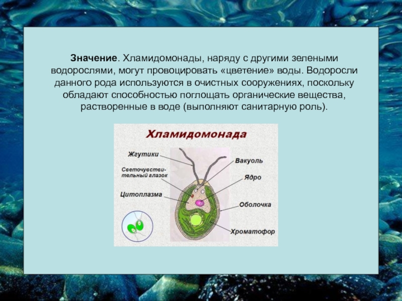 Слайд 6Значение. Хламидомонады, наряду с другими зелеными водорослями, могут провоцировать «цветение» воды.