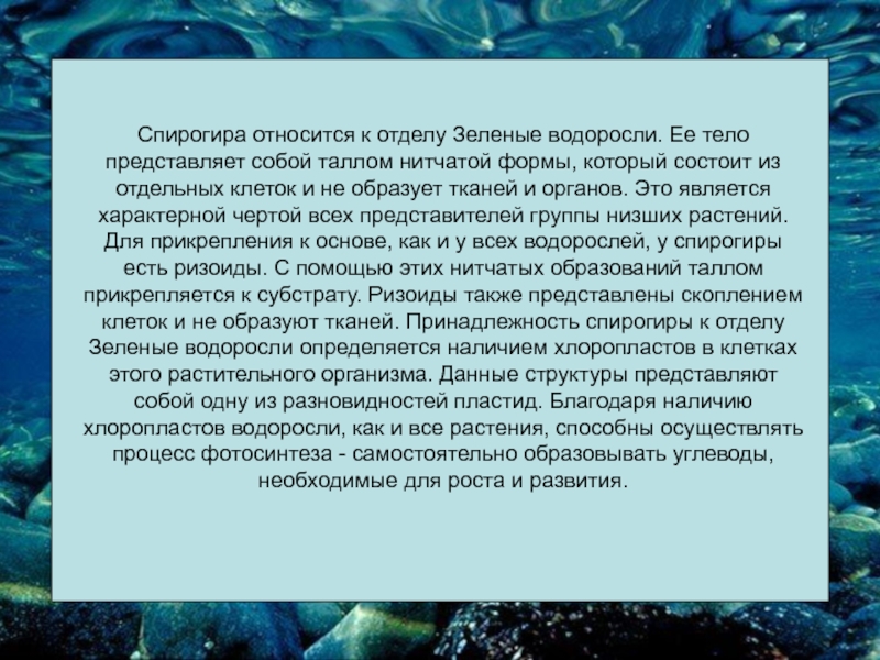нитчатой формы, который состоит из отдельных клеток и не образует тканей и органов. Это является характерной чертой всех представителей группы низших растений. Для прикрепления к основе, как и у всех водорослей, у спирогиры есть ризоиды. С помощью этих нитчатых образований таллом прикрепляется к субстрату. Ризоиды также представлены скоплением клеток и не образуют тканей. Принадлежность спирогиры к отделу Зеленые водоросли определяется наличием хлоропластов в клетках этого растительного организма. Данные структуры представляют собой одну из разновидностей пластид. Благодаря наличию хлоропластов водоросли, как и все растения, способны осуществлять процесс фотосинтеза - самостоятельно образовывать углеводы, необходимые для роста и развития.
