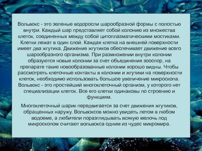 Слайд 11Вольвокс - это зеленые водоросли шарообразной формы с полостью внутри. Каждый