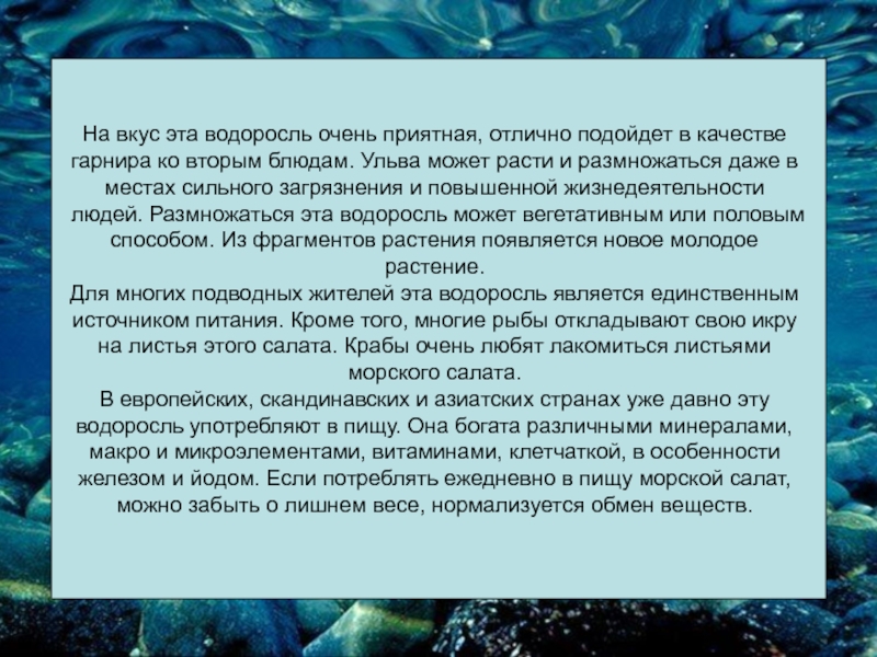 Слайд 16Ульва или морской салат относится к съедобным зеленым водорослям, отличается очень