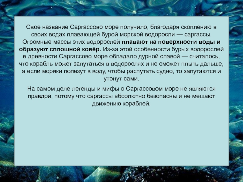 На самом деле легенды и мифы о Саргассовом море не являются правдой, потому что саргассы абсолютно безопасны и не мешают движению кораблей.