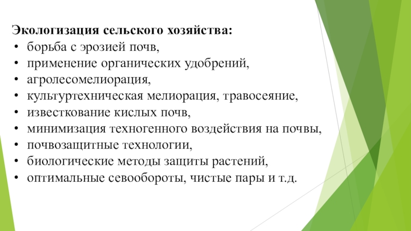 Экологизация сельского хозяйства:борьба с эрозией почв, применение органических удобрений, агролесомелиорация, культуртехническая мелиорация, травосеяние, известкование кислых почв, минимизация
