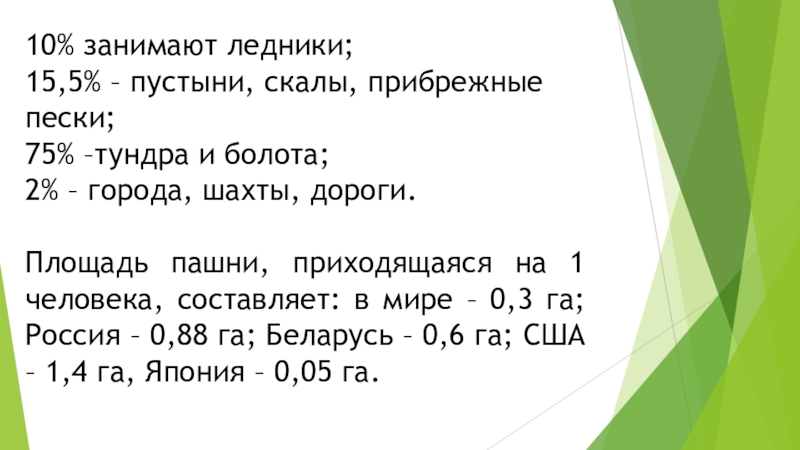 Площадь пашни, приходящаяся на 1 человека, составляет: в мире – 0,3 га; Россия – 0,88 га; Беларусь – 0,6 га; США – 1,4 га, Япония – 0,05 га.