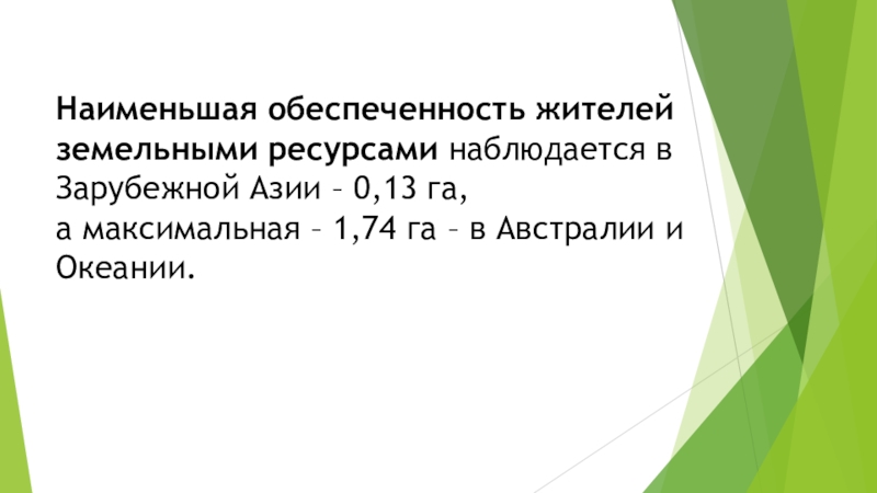 Слайд 4Наименьшая обеспеченность жителей земельными ресурсами наблюдается в Зарубежной Азии – 0,13
