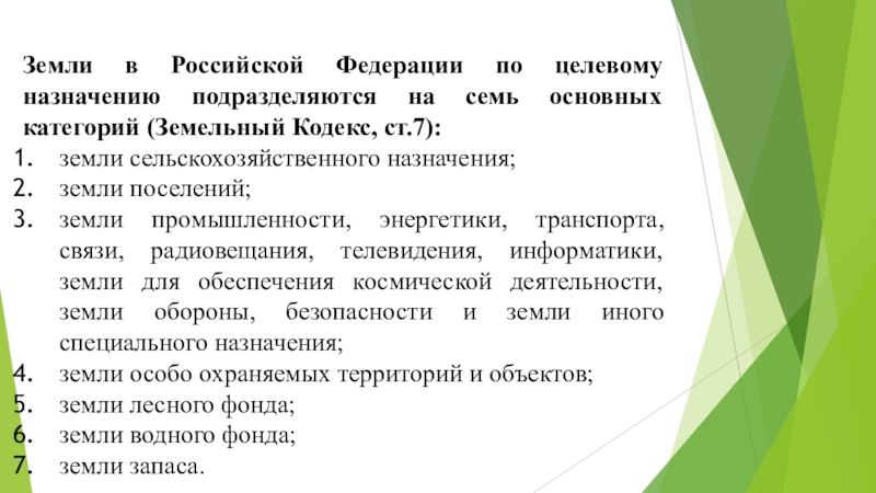 Слайд 5Земли в Российской Федерации по целевому назначению подразделяются на семь основных