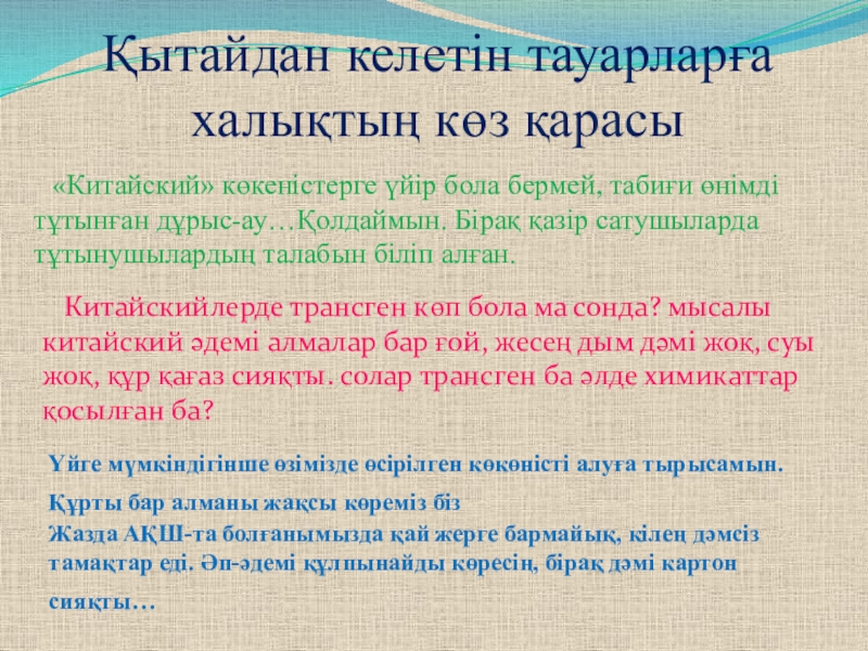 Китайскийлерде трансген көп бола ма сонда? мысалы китайский әдемі алмалар бар ғой, жесең дым дәмі жоқ, суы жоқ, құр қағаз сияқты. солар трансген ба әлде химикаттар қосылған ба?