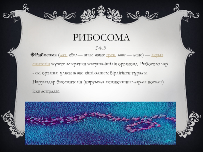 РибосомаРибосома (лат. rіbes — ағыс және грек. some — дене) — ақуыз синтезін жүзеге асыратын жасуша-ішілік органоид. Рибосомалар - екі орташа: үлкен және кіші өлшем