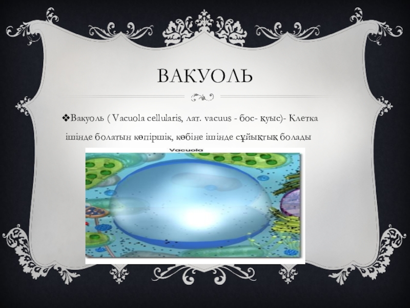 ВакуольВакуоль ( Vacuola cellularis, лат. vacuus - бос- қуыс)- Клетка ішінде болатын көпіршік, көбіне ішінде сұйықтық болады