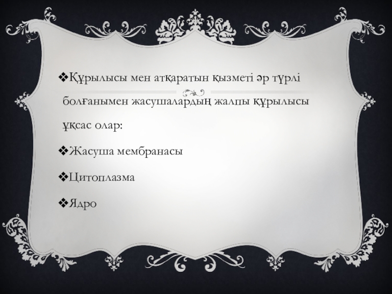 Слайд 2Құрылысы мен атқаратын қызметі әр түрлі болғанымен жасушалардың жалпы құрылысы ұқсас