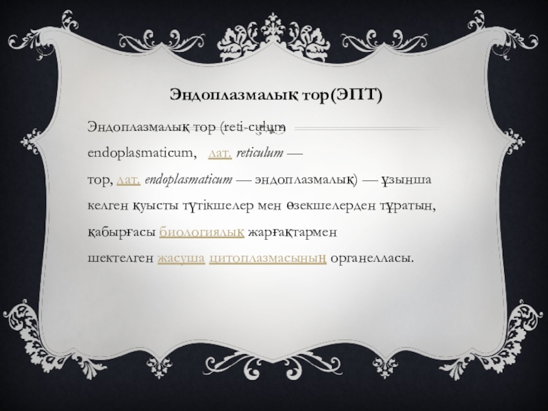 Эндоплазмалық тор(ЭПТ)Эндоплазмалық тор (reti-culum endoplasmaticum,  лат. reticulum — тор, лат. endoplasmaticum — эндоплазмалық) — ұзынша келген қуысты түтікшелер мен өзекшелерден тұратын,