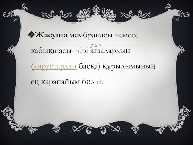 Слайд 5Жасуша мембранасы немесе қабықшасы- тірі ағзалардың (вирустардан басқа) құрылымының ең қарапайым бөлігі.